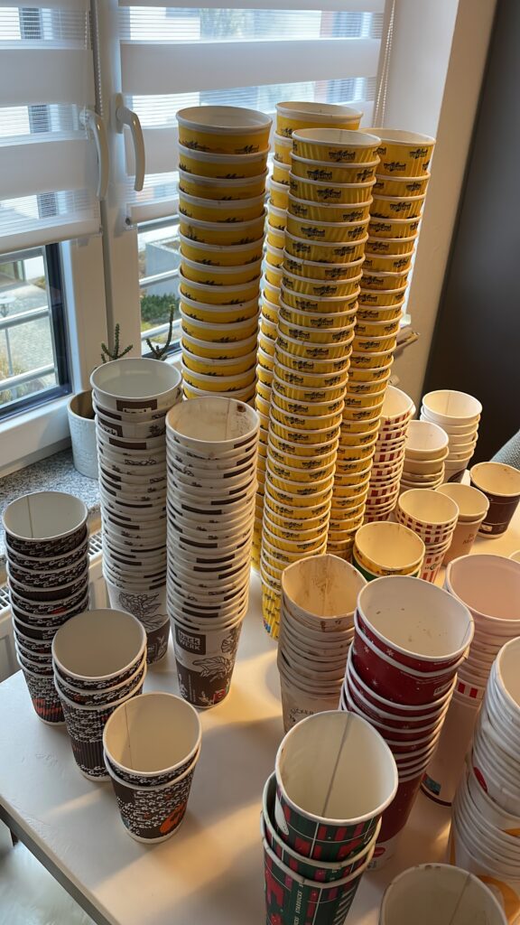 Und jetzt? Erstmal werden alle fein säuberlich mit der Hand ausgespült, da sich in den meisten Bechern neben diversen Flüssigkeiten, auch gerne Mal ein Double Chocolate Frappuccino oder Zigarettenkippen befinden (lecker).