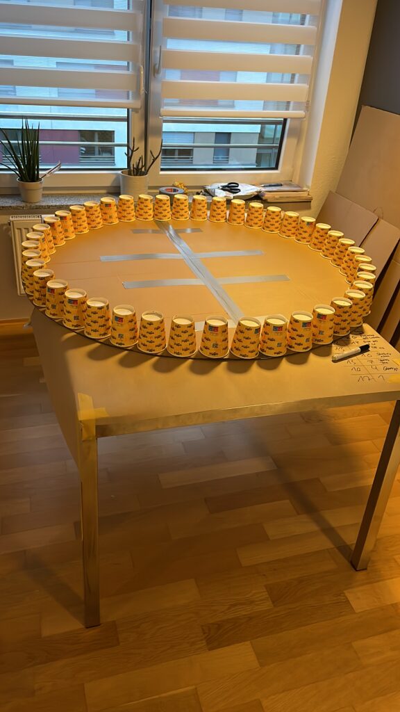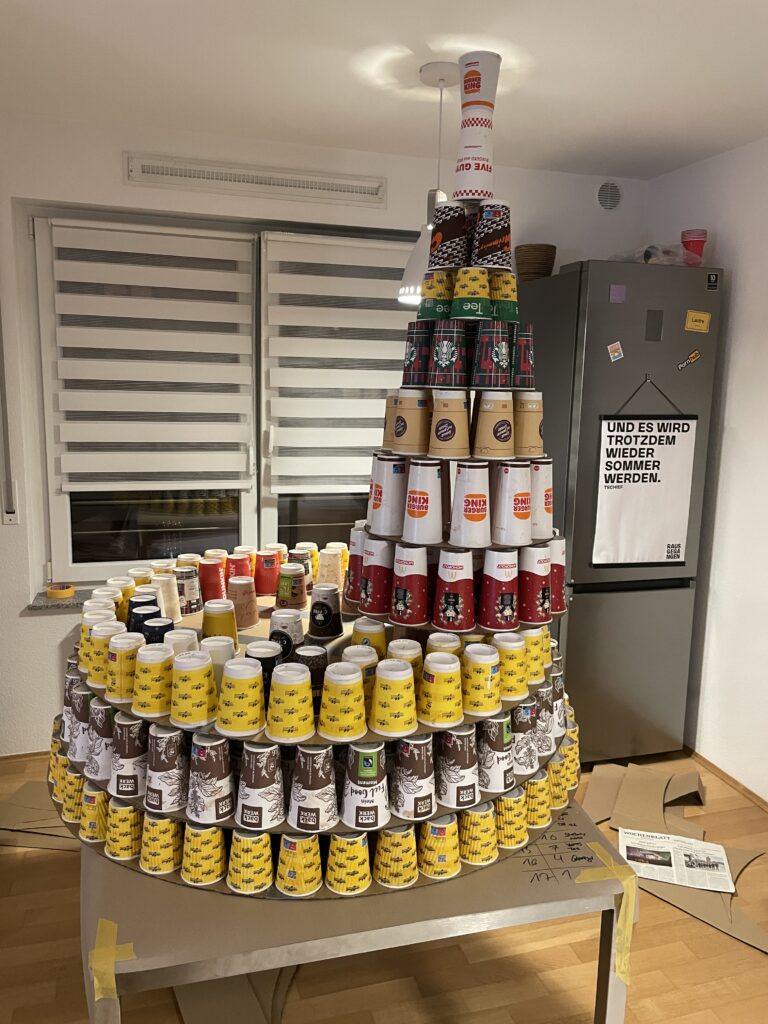 Anschließend wurden alle Becher nach Verursacher (ähm Farben) und Größe sortiert und gestapelt. Und was darf an Weihnachten nicht fehlen? Genau ein Weihnachtsbaum! Oder besser gesagt ein CupMess Tree.