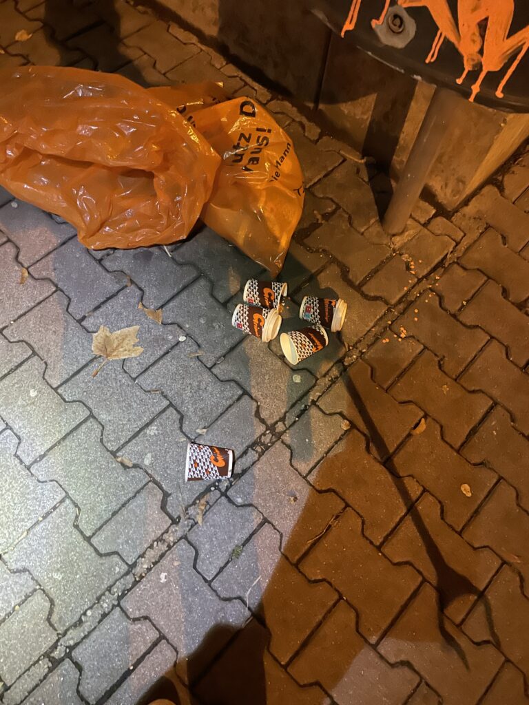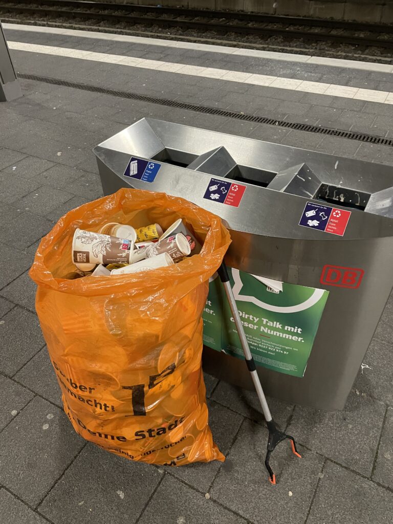 Um auf diesen enormen Ressourcenverbrauch und die dadurch entstehende Umweltverschmutzung aufmerksam zu machen, haben wir im Winter 2023 in vier Stunden mit drei Personen im und rund um den Mannheimer Hauptbahnhof weggeworfene Einwegbecher gesammelt.