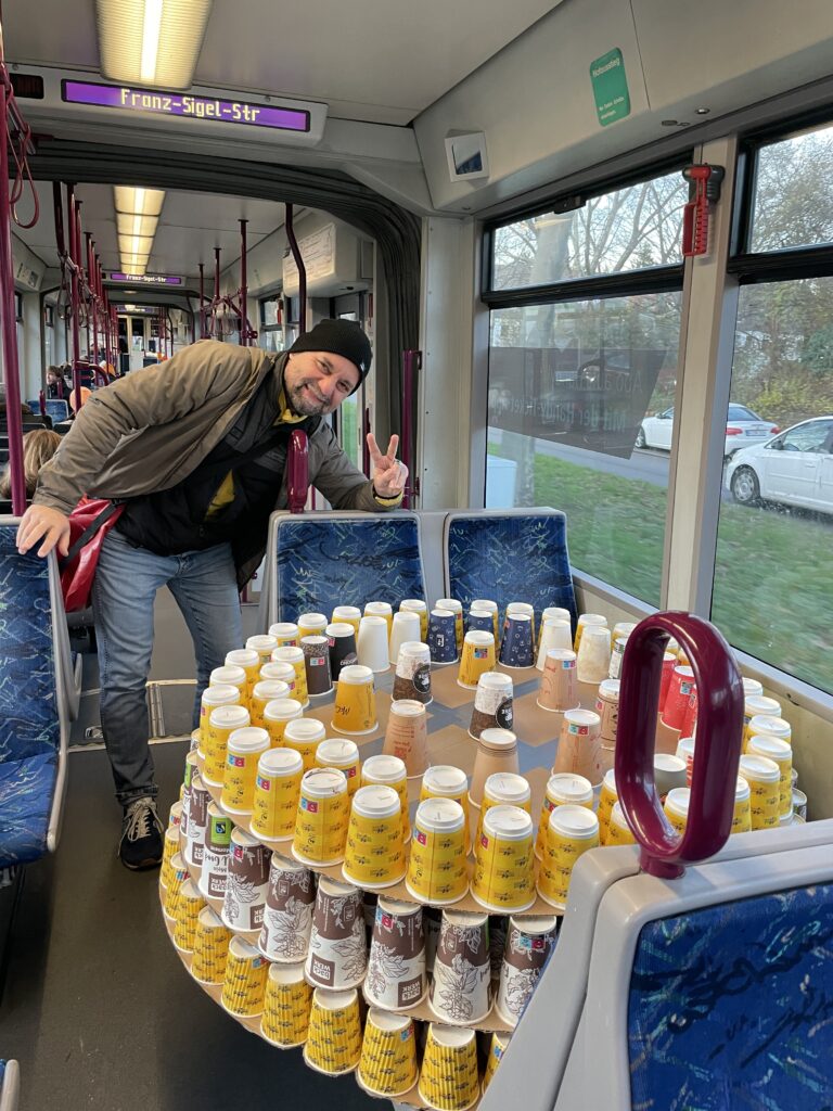 Und wo präsentiert man solch ein Kunststück am besten in Mannheim, um möglichst viele Menschen auf die Problematik von Einwegbechern aufmerksam zu machen?