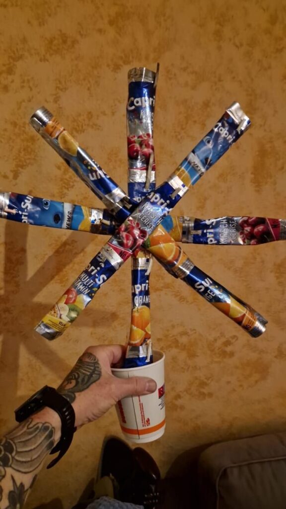 Genau, der Stern! Und auch hier müssen wir einfach nur auf die Straßen Mannheims schauen, um in kürzester Zeit genügend Capri-Sun-Verpackungen aufzuheben, um daraus einen wunderschönen Weihnachtsstern zu basteln.